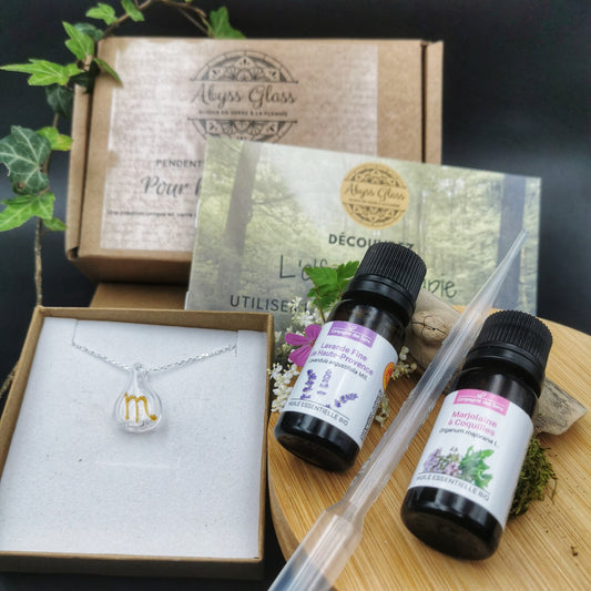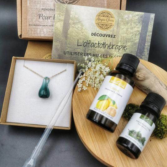 Le pendentif d'olfacto-thérapie est très beau, et je ne doute pas de son utilité ! Le coffret est complet (pipette, huile essentielle, notice) et Céline (et/ou équipe de Céline) est très réactive selon les problématiques rencontrées au cours de l'achat (achat en double par inadvertance). La seule amélioration que je vois (et c'est vraiment du chipotage), ce serait de réduire le format du prospectus Abyss Glass pour qu'il rentre parfaitement dans les boîtes/coffrets). Bref, de la transparence, de la qualité, de l'esthétique, on adore et on soutient !