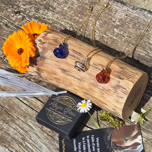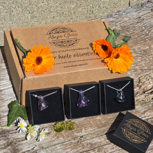 Le pendentif d'olfacto-thérapie est très beau, et je ne doute pas de son utilité ! Le coffret est complet (pipette, huile essentielle, notice) et Céline (et/ou équipe de Céline) est très réactive selon les problématiques rencontrées au cours de l'achat (achat en double par inadvertance). La seule amélioration que je vois (et c'est vraiment du chipotage), ce serait de réduire le format du prospectus Abyss Glass pour qu'il rentre parfaitement dans les boîtes/coffrets). Bref, de la transparence, de la qualité, de l'esthétique, on adore et on soutient !