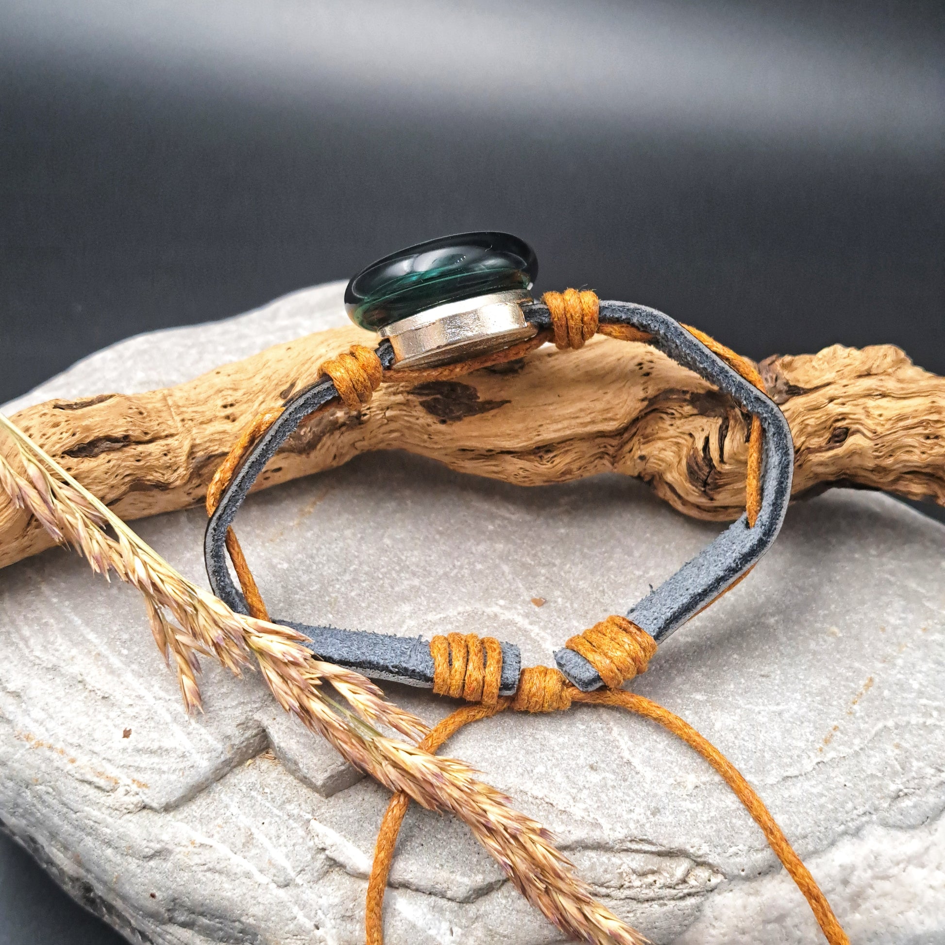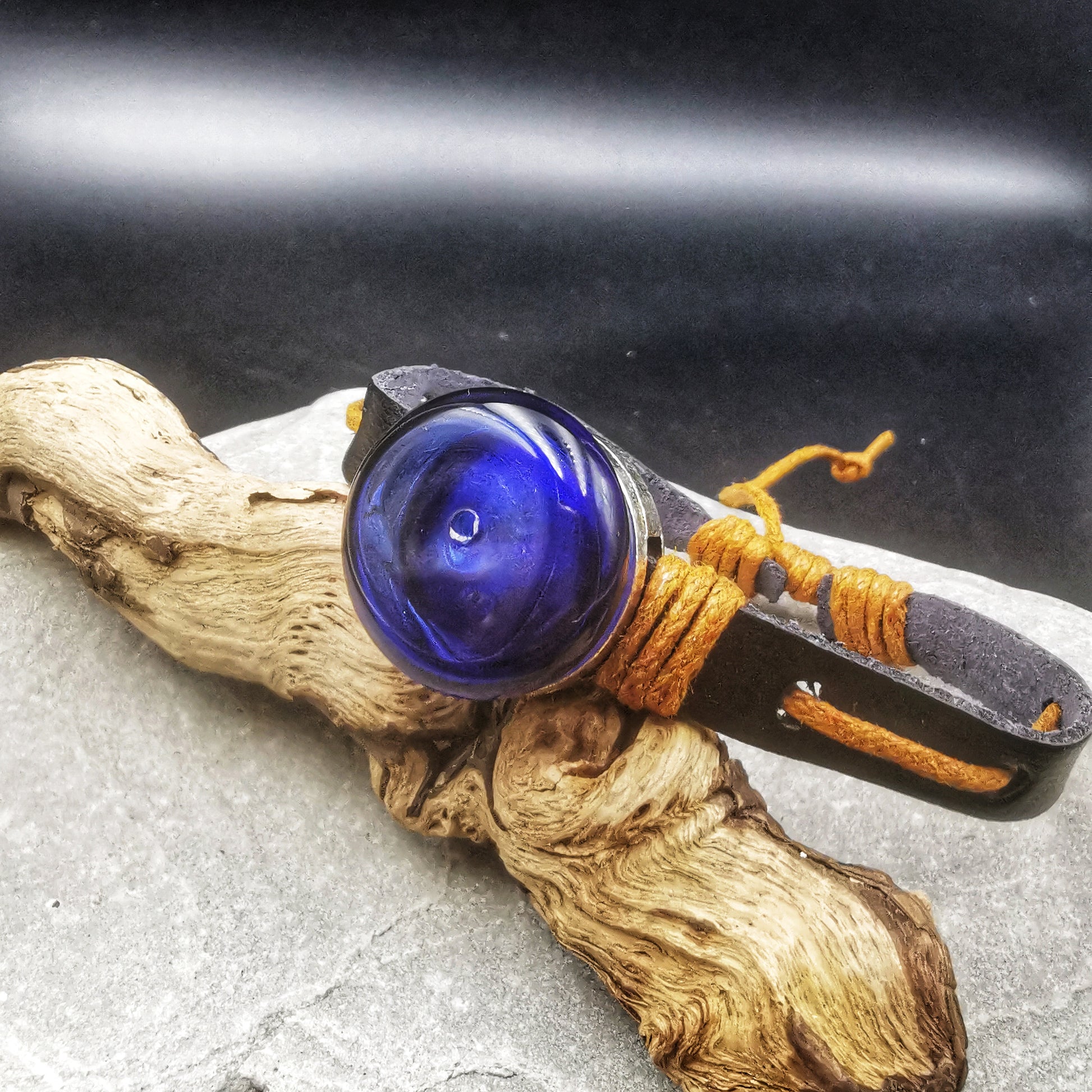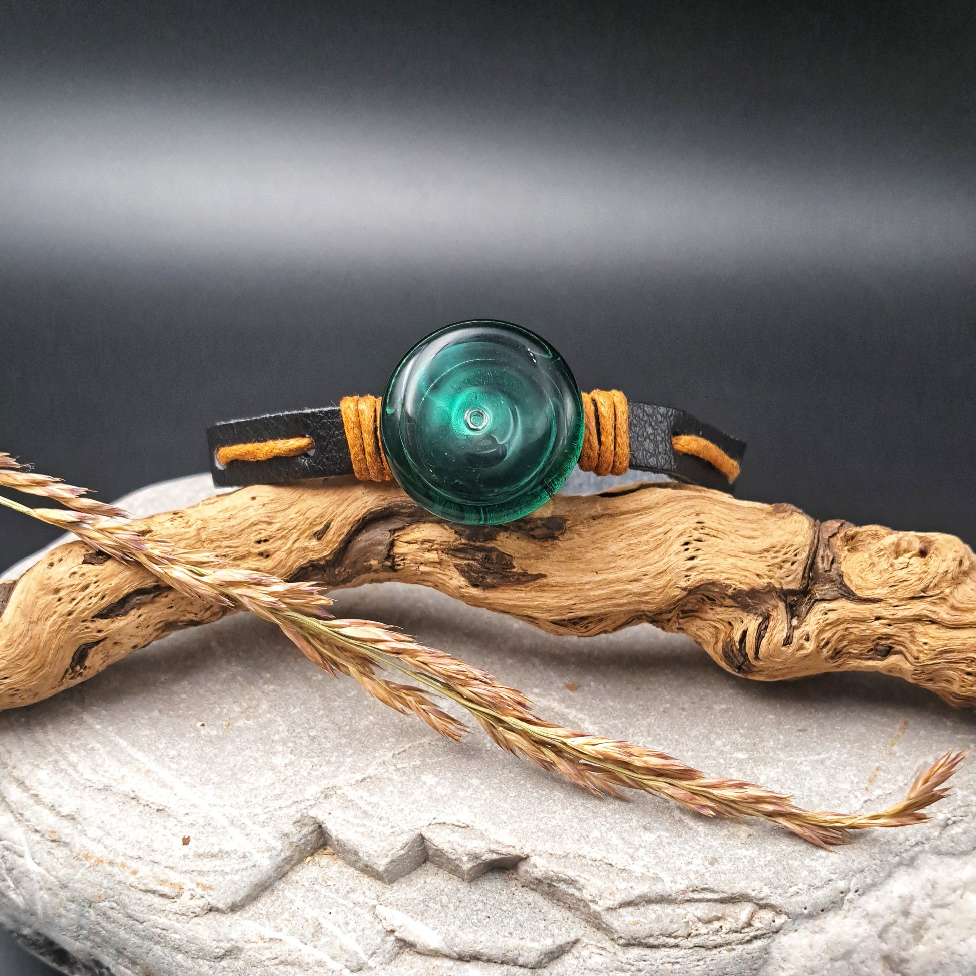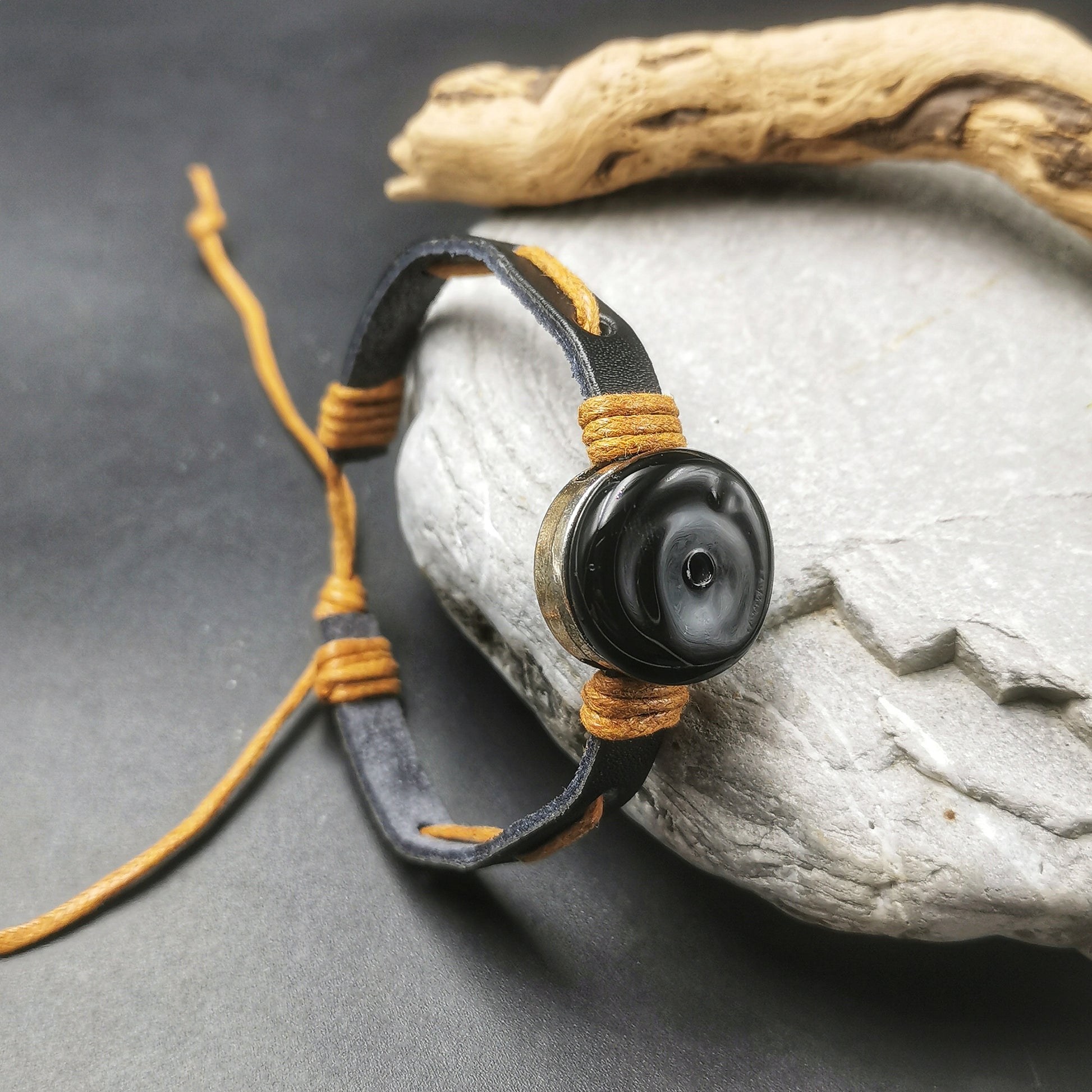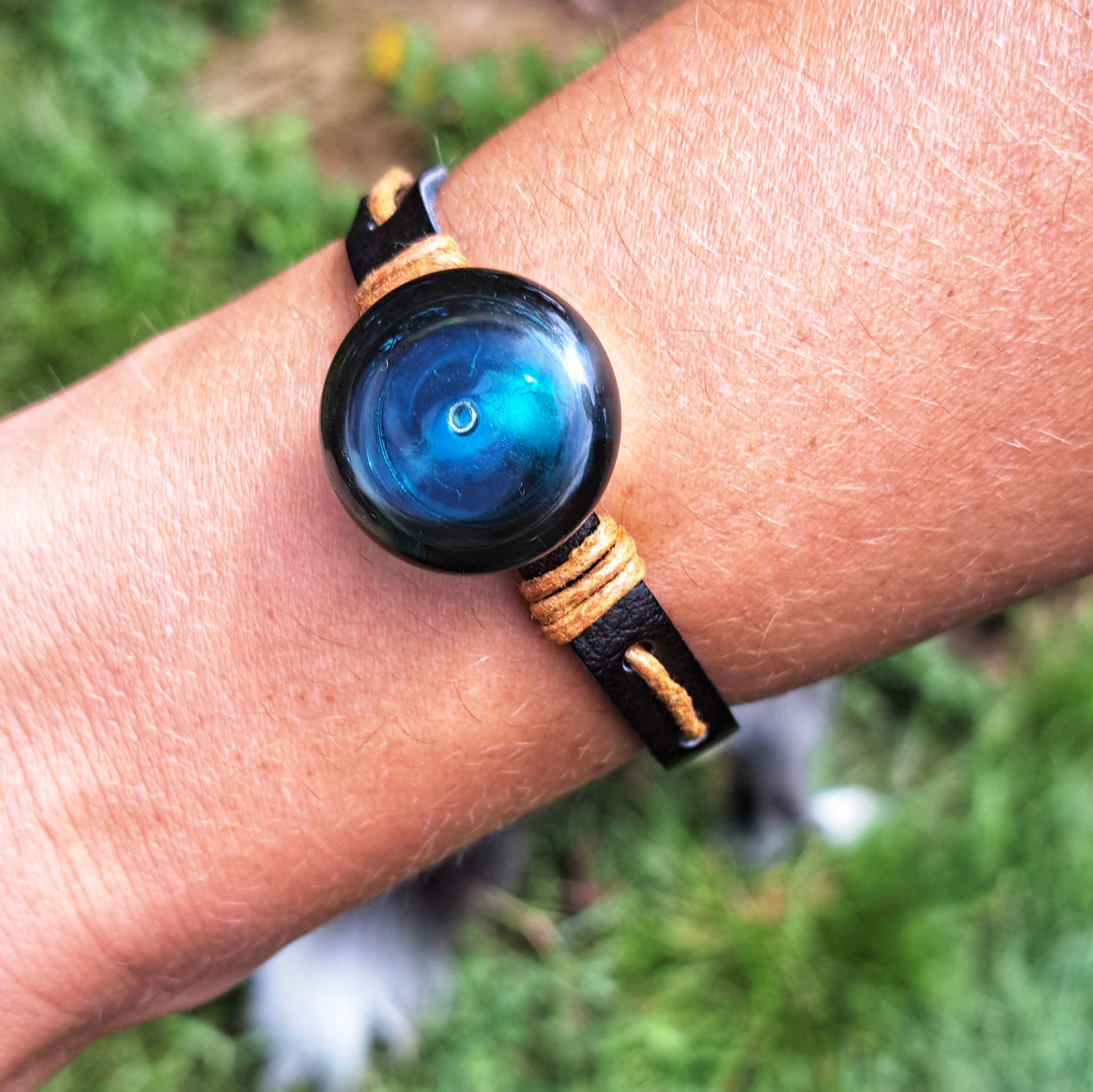 1er bracelet pour mon fils de 14 ans. Il l'adore et le quitte uniquement pour prendre sa douche. Le bracelet en cuir est très beau de grande qualité et sent bon le cuir. Le bijou en verre soufflé noir est magnifique. A l'intérieur il met de l'immortel. Il est très content. Il dit à tous ses amis que son bijou est unique et artisanal. Trop trop fier. Merci beaucoup Céline pour votre formidable travail. J'en parle à tout le monde. Cet été pour mon anniversaire ce sera une bague.